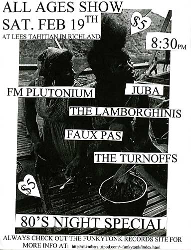 Before this show Lee's Tahitian was strictly a 21+ venue. I talked with Ming (the owner) and convinced him to do all ages shows since the bar was a completely seperate room. We really needed it too. I think for all of 1998 and 1999 we didn't have alot of places to do all ages shows. Ming just wanted to make sure that no kids got into the bar area so we basically used the old D.C. policy from the 80's of drawing a big black X on the underage kids hands. Worked great! We ran shows here for about a year I think. Ryan Phillips of then Faux Pas (currently Crystal Skulls) was a huge part in this. He always seemed to be able to come up with a PA for the shows. Super fun times. Lees Tahitian was smaller than 321. Every show we did here was packed to the door. I eventually quit running shows here because Ming ripped me off of the door money one night.
