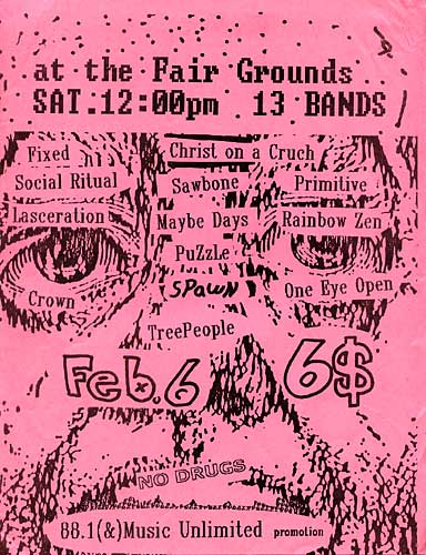 we were added to this show so late that we were sharpied in! (spawn) It was very cool to play a show with the treepeople on the same bill, although we we practically played years before them! (long show!) I enjoyed watching crown.... I believe this was a show they went a little crazy with the mics and were tackling monitors. good stuff and nearly as memorable as joe singing with schedule while hanging upside-down from the hoedown rafters