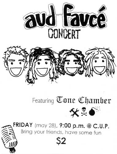 This was Aud Fauce's first official show with our own music, and we just released our album Trying Muto, so we were sure to set it up as soon as possible. We didn't have another band to open for us though, so we put "Tone Chamber" on the flyer as sort of a joke (we always thought that Tone Chamber sounded like a good name for some nu metal group). But then we figured we should probably do SOMETHING as an opening act, so we dressed up in ganster clothes and performed a rap song we wrote as "Tone Chamber" a few minutes before Aud Fauce took the stage. The crowd enjoyed it very much, and it was a $2 show, so they couldn't have felt THAT ripped off.