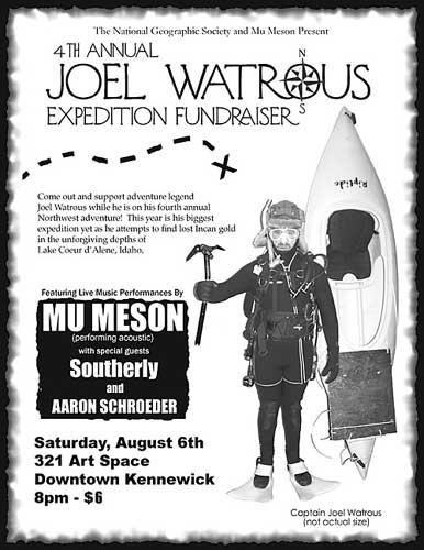 The ultimate plan for this show was to have there be a live television feed from the mountains where Joel was. He was to paddle up to shore and come out of a canoe in a scuba suit and tell us of his new found fortunes. Good thing we passed on this idea. Great flyer though done by Brett Bradford.
